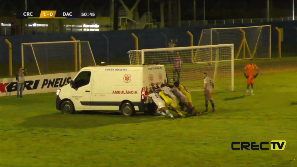Ambulância usada para socorro de um atleta ficou atolada no gramado e precisou ser empurrada por jogadores das duas equipes (imagem: CrecTV)
