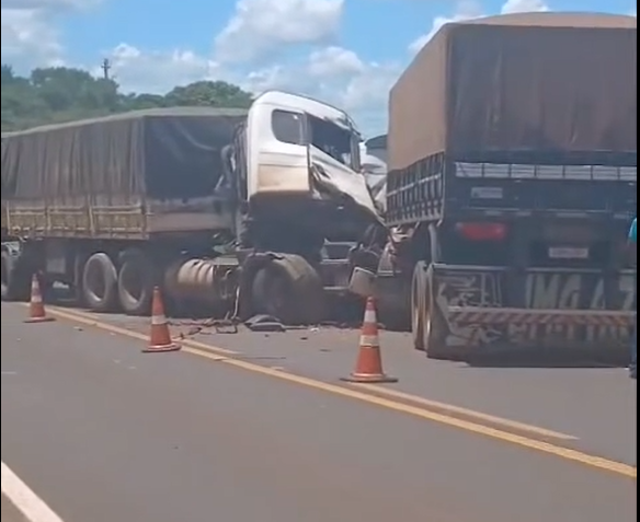 Um condutor ficou ferido após a colisão frontal entre duas carretas, na manhã desta terça-feira (10), na BR-376, entre Deodápolis (MS) e Ivinhema (MS).